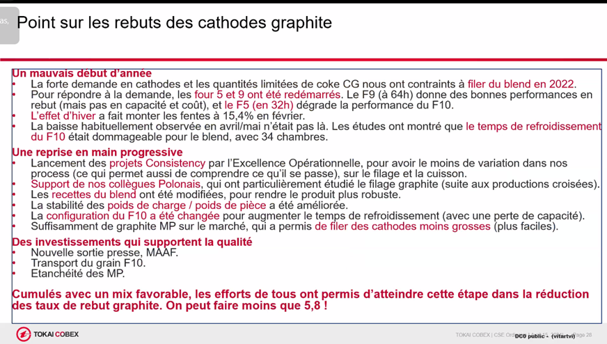 - Record absolu sur le taux de rebut graphite avec 3.6% fentes avec formulation blend, 0.7% écailles, 0.4% manque matière. Les fentes continuent à s’améliorer en cuisson, les autres ateliers sont aussi en amélioration.