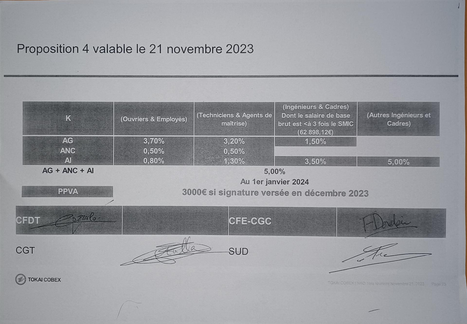 La direction a accepté notre dernière proposition et de ce fait l'ensemble des organisations syndicales signe cet accord de NAO pour 2024.